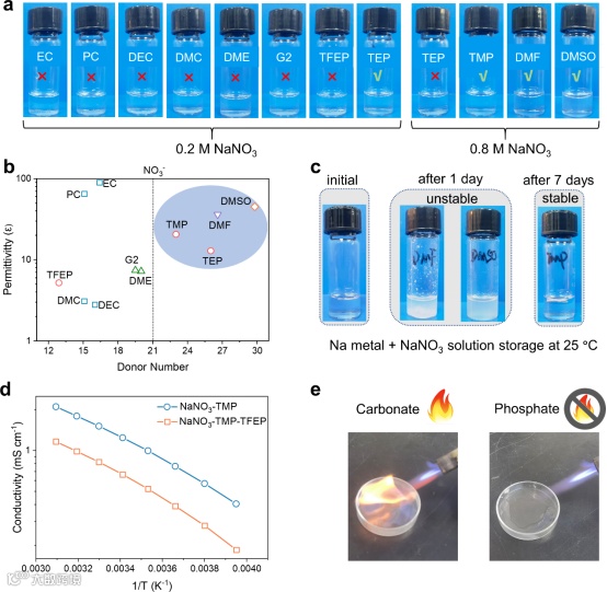 图2. 基于高DN值与高介电常数的TMP构建高NaNO3溶解度的阻燃电解液。