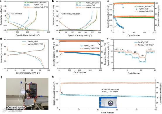 图3. 基于NaNO3的磷酸酯电解液与HC和NFPP电极的电化学相容性。