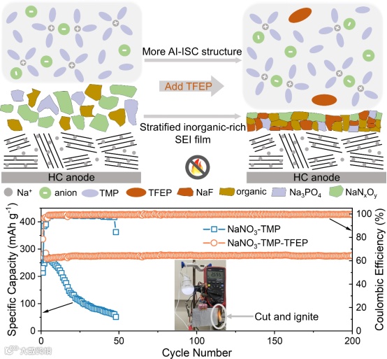 研究团队基于DN值和介电常数两个维度筛选出了具有高DN值与高介电常数的磷酸三甲酯(TMP),构建了高NaNO3溶解度且具有良好阻燃性的电解液体系。并进一步引入三(2,2,2-三氟乙基)磷酸酯(TFEP)作为共溶剂,调控溶剂化结构,增强电解液还原稳定性,并实现稳定SEI膜的构筑。