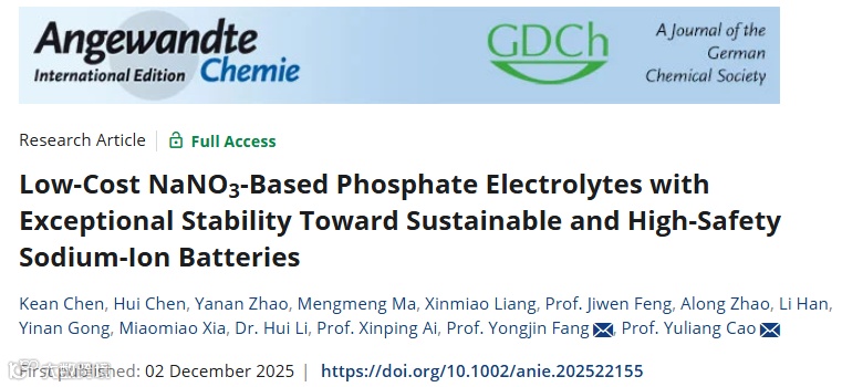 近日,武汉大学曹余良教授和方永进教授团队,在国际知名期刊《Angewandte Chemie International Edition》上发表题为“Low-Cost NaNO3-Based Phosphate Electrolytes with Exceptional Stability Toward Sustainable and High-Safety Sodium-Ion Batteries”的研究论文,首次报道了一种以NaNO3为唯一钠盐、基于磷酸酯双溶剂的低成本、高安全钠离子电池电解质体系。该研究通过溶剂组成调控,成功实现NaNO3的高效溶解,并构建出富含无机成分的稳定SEI膜,显著提升了硬碳负极和聚阴离子正极的循环稳定性与安全性。