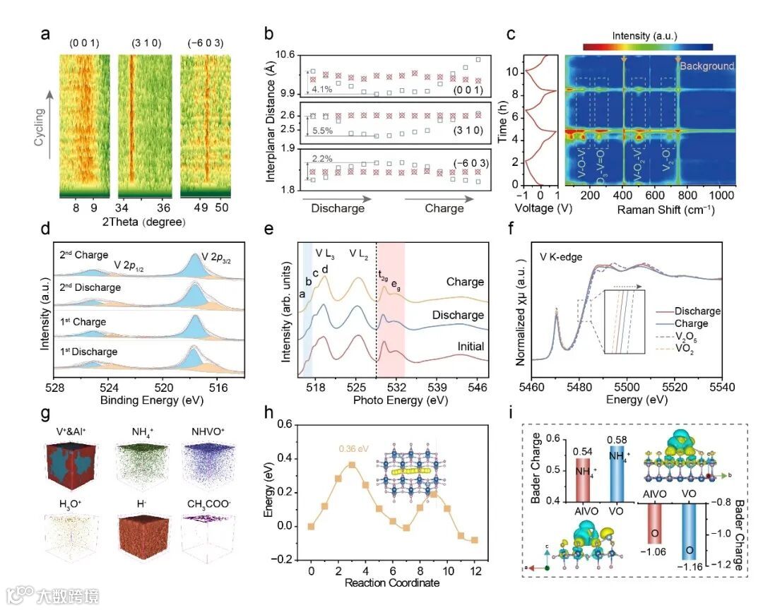Raman 与 XPS/sXAS 证明 AlVO 的振动模式和价态变化高度可逆,结构在充放电过程中保持稳定。 -