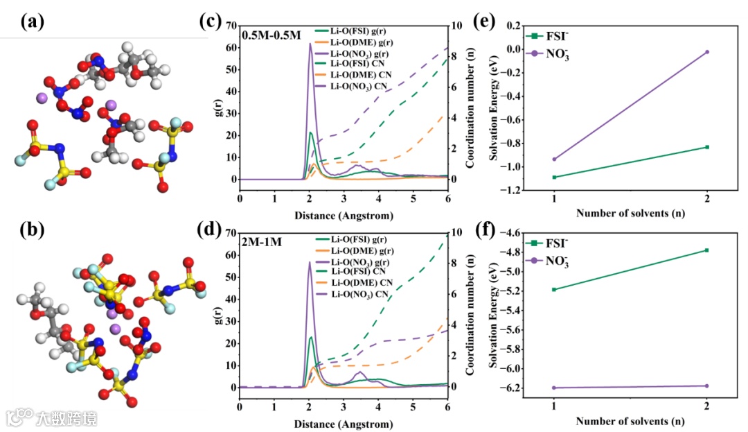 图1. 溶剂化结构分析:(a, b) 0.5M-0.5M与2M-1M条件下典型Li+溶剂化构型;(c, d) 对应的径向分布函数(RDFs);(e) 二甲醚中LiFSI与LiNO3的脱溶剂化能垒;(f) Li+配位球中阴离子的解离能。