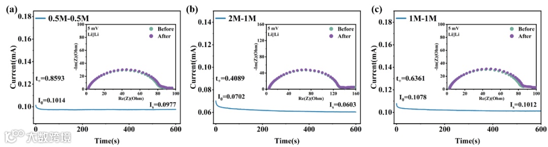 图 2. (a-c) 不同电解液配方中Li⁺转移数的测定。