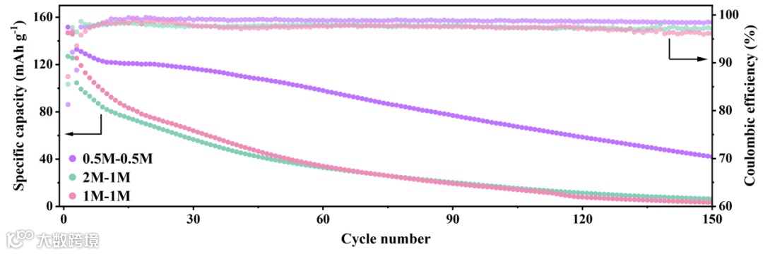贫液测试:在仅注液20 μL的严苛条件下,0.5M-0.5M电解液循环80圈后仍保持82.29 mAh g-1的容量,而高浓度组早已因润湿性差和副反应导致容量衰减至20 mAh g-1左右 。