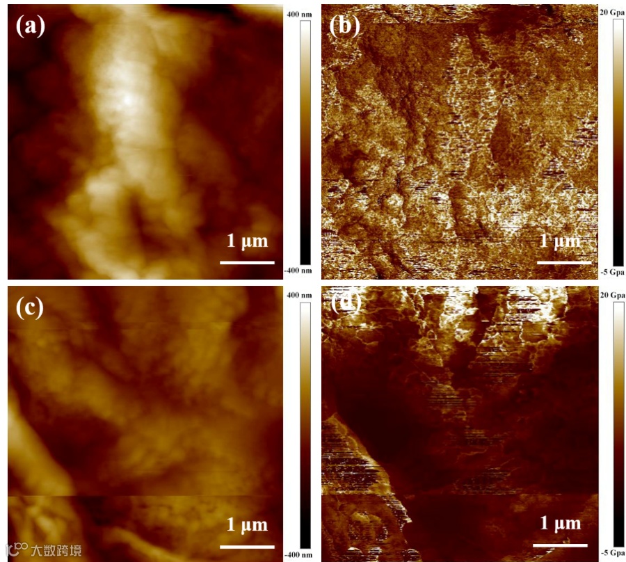 图 3. (a, c) 0.5M-0.5M 与 2M-1M 的原子力显微镜表面形貌及 (b, d) 杨氏模量分析。