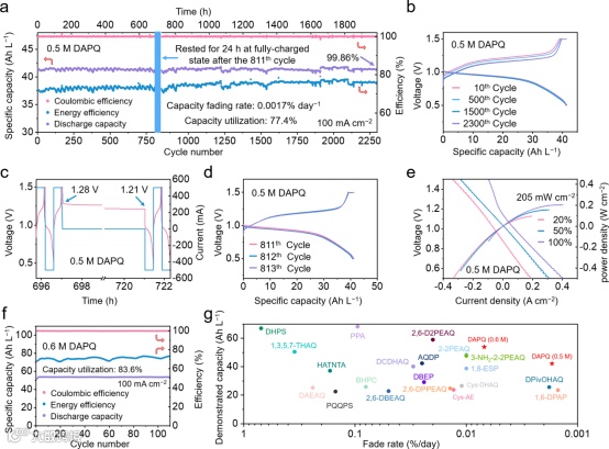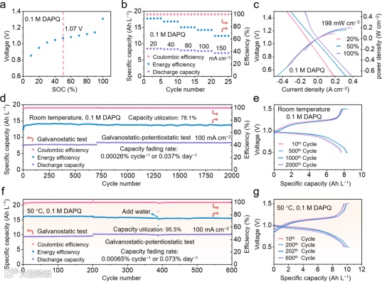 图3. 基于0.1 M DAPQ||K4[Fe(CN)6] AORFBs的电化学性能。