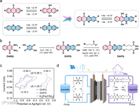 图1. DAPQ分子的设计、合成步骤以及氧化还原电位。