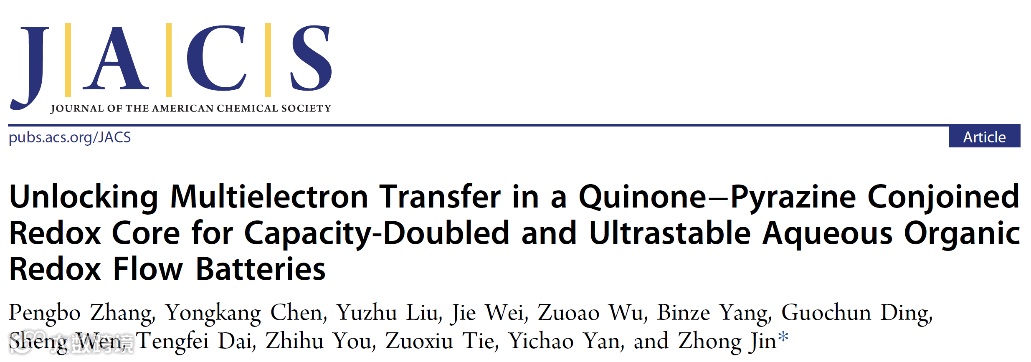 近日,来自南京大学的金钟教授,在国际知名期刊Journal of the American Chemical Society上发表题为“Unlocking Multielectron Transfer in a Quinone−Pyrazine Conjoined Redox Core for Capacity-Doubled and Ultrastable Aqueous Organic Redox Flow Batteries”的研究文章。该文章针对目前AORFBs体系中稳定性差、能量密度低等问题,通过构建π-共轭多电子氧化还原核心,获得了高稳定性、高能量密度的储能分子并扩展了可用于大规模储能的氧化还原分子的种类。