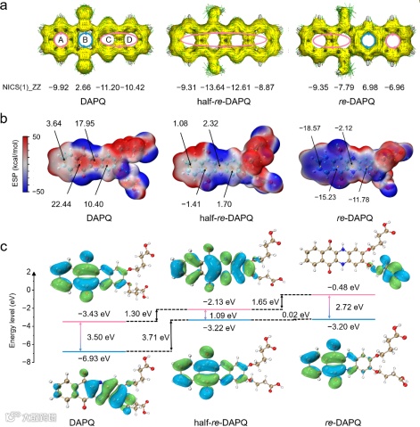 图2. 原始及不同还原态下DAPQ分子的DFT计算。
