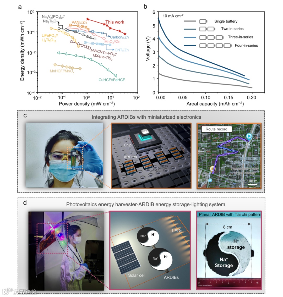 应用该ARDIB创新机制构筑的微型电池在1 mA cm−2下实现0.42 mWh cm−2能量密度,在10 mA cm−2下可稳定循环5700次。其功率密度最高可达30.8 mW cm−2,优于大多数已报道的微型电池。此外,该电池具有良好的集成性和可扩展性,通过串联集成可驱动GPS定位芯片,按太极图案放大的电池组可与光伏系统集成,在夜间持续为LED灯带供电,展示了其在微型电子设备和规模化储能中的广阔应用前景。