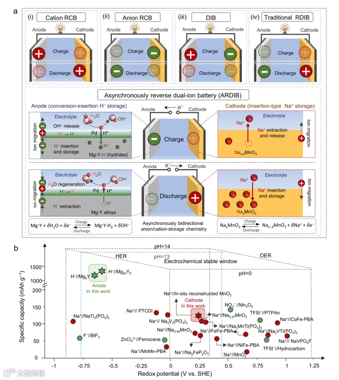 不同于传统的阳离子/阴离子摇椅式电池(RCB)或同步双离子电池(DIB/RDIB),本文提出的ARDIB采用异步双向离子存储机制。在充电过程中,Mg-Y合金负极通过转化-嵌入反应存储H−阴离子(形成金属氢化物),而正极释放Na+;放电过程则相反,负极释放H−,正极嵌入Na+。这种机制通Pd催化层促进水分子的解离和H物种的嵌入,成功将高容量的H−存储负极与Na+存储正极在水系电解液中耦合,实现了离子的异步存储。