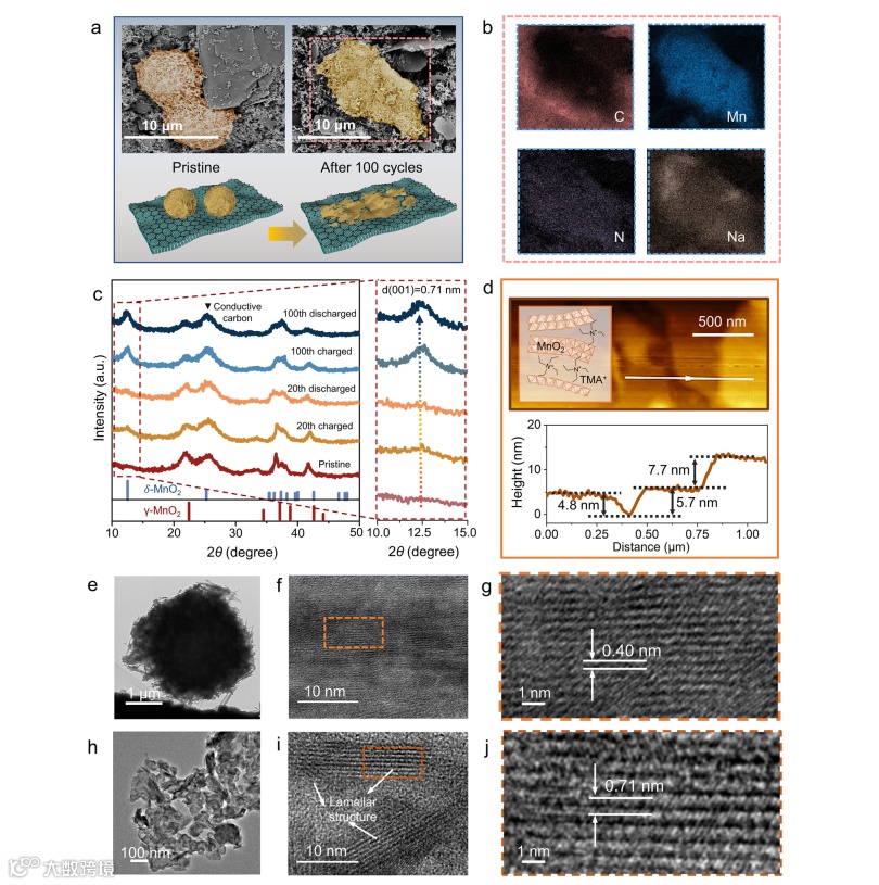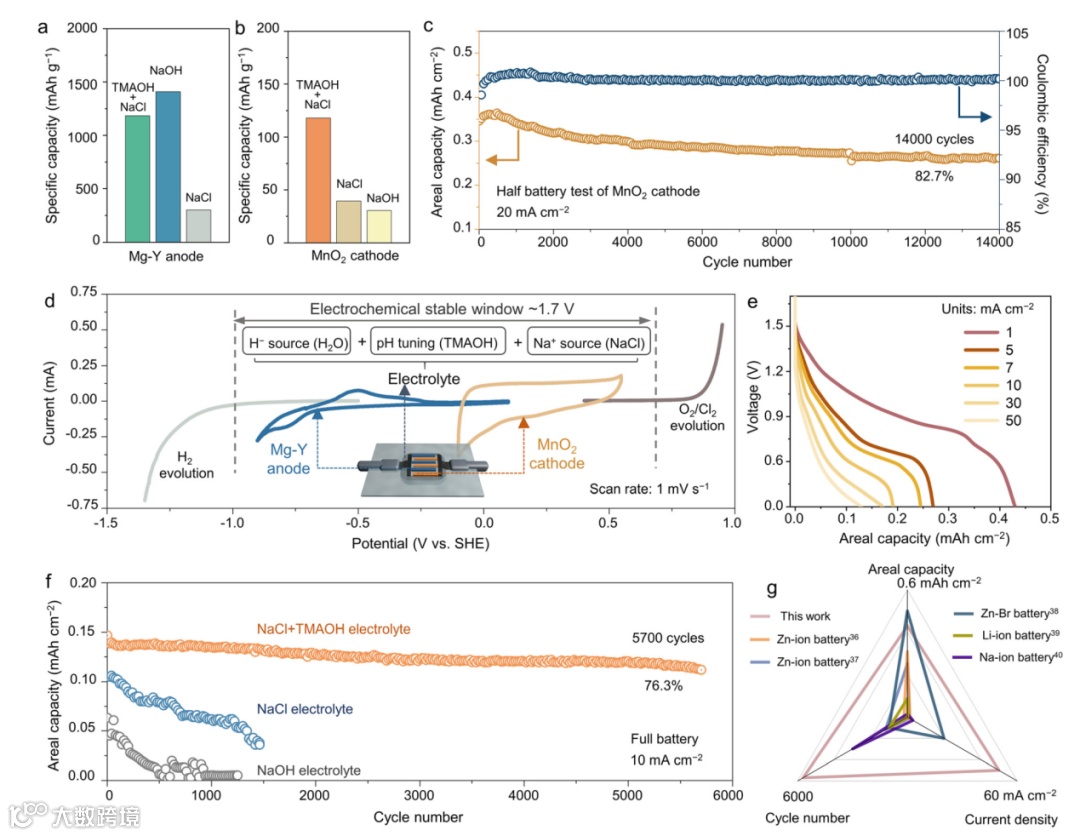为了匹配Mg-Y负极和MnO2正极的电位并保证稳定性,研究团队设计了含有四甲基氢氧化铵(TMAOH)的NaCl水系碱性电解液。研究发现,TMAOH的添加不仅提供了合适的电化学稳定窗口,更关键的是触发了微米级球状MnO2正极在循环过程中发生原位重构。大尺寸TMA+离子的嵌入起到了支柱作用,扩大了层间距,促使厚 MnO2电极转变为锚定在石墨烯网络上的超薄纳米片结构,显著提升了厚电极的反应动力学和结构稳定性。