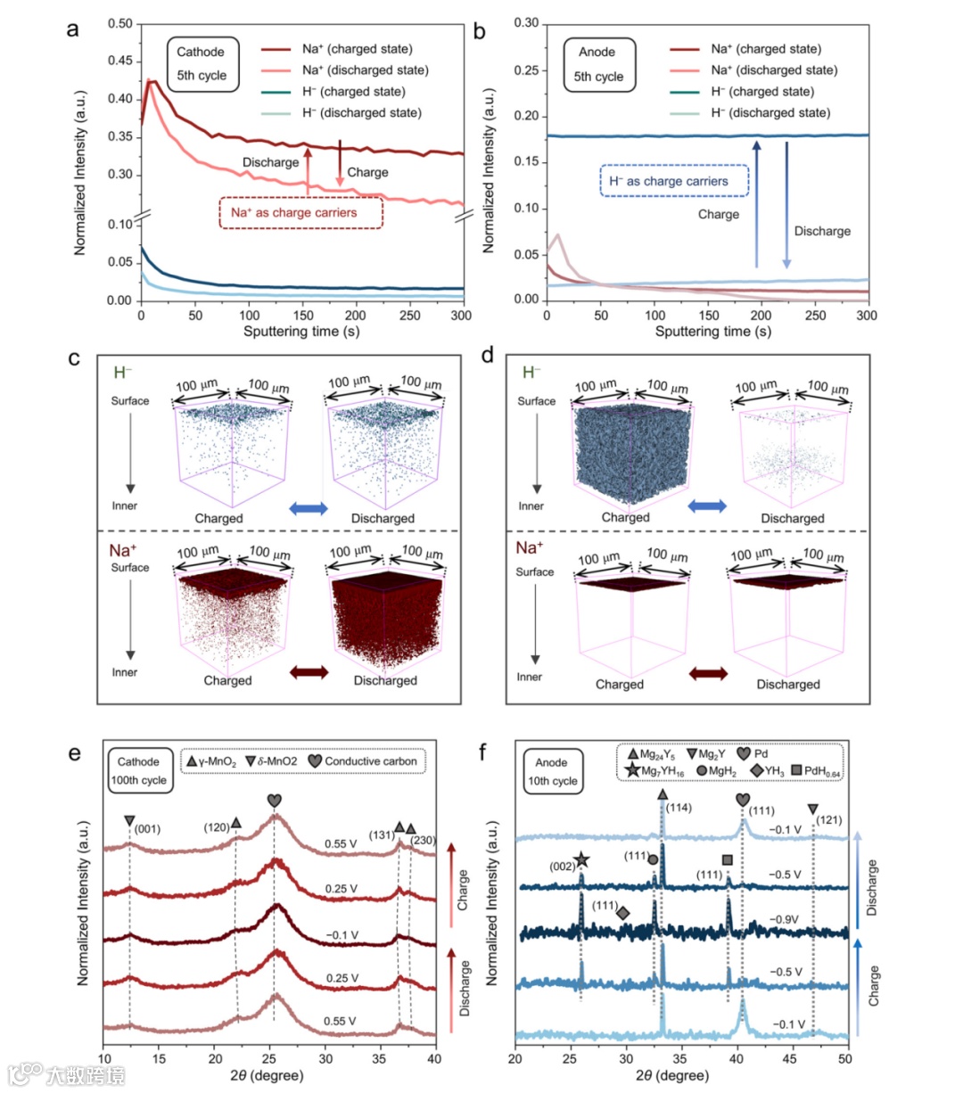 通过飞行时间二次离子质谱(TOF-SIMS)和非原位XRD深入解析了电极的储能机理。这些结果证明了ARDIB独特的“负极充电态储氢阴离子、正极放电态储钠阳离子”的运行机制,验证了该电池独特的异步逆向双离子存储工作机理。