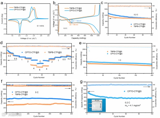 图3. (a) TBPB-CTF@S 和 CPTO-CTF@S 的CV曲线; (b) CPTO-CTF@S与 TBPB-CTF 电极在 0.2 C 下的恒电流充放电曲线对比;(c) TBPB-CTF@S 和 CPTO-CTF@S 电极在 0.2 C 下循环 100 次的性能对比。(d) TBPB-CTF@S 和 CPTO-CTF@S 电极在 0.2 C 至 5 C 下的倍率性能测试;(e) TBPB-CTF@S 和 CPTO-CTF@S 电池在 1.0 C 下循环 200 次的循环性能;(f) TBPB-CTF@S 和 CPTO-CTF@S 电池在 5 C 下长循环 600 次的循环稳定性;(g) 硫载量为 4.1 mg cm-2 的 CPTO-CTF@S 软包电池在 0.2 C 下循环 100 次的循环性能。