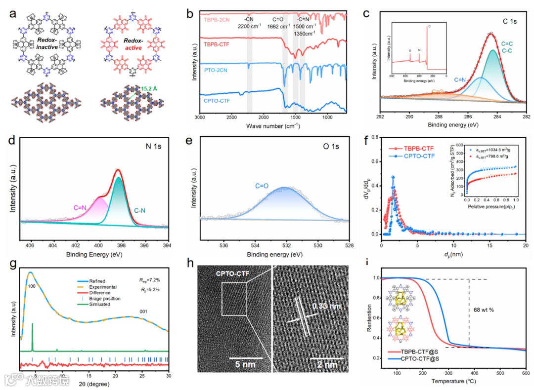 图1. (a) TBPB-CTF 与 CPTO-CTF 的结构示意图;(b) TBPB-2CN、PTO-2CN、TBPB-CTF 和 CPTO-CTF 的FT-IR曲线;(c) CPTO-CTF 的 C 1s XPS 谱图;(d) CPTO-CTF 的 N 1s XPS 谱图;(e) CPTO-CTF 的 O 1s XPS 谱图;(f) TBPB-CTF 和 CPTO-CTF 在 BET图谱;(g) CPTO-CTF 的PXRD图谱;(h) CPTO-CTF 的HR-TEM图谱;(i) TBPB-CTF@S 和 CPTO-CTF@S 的TGA曲线。