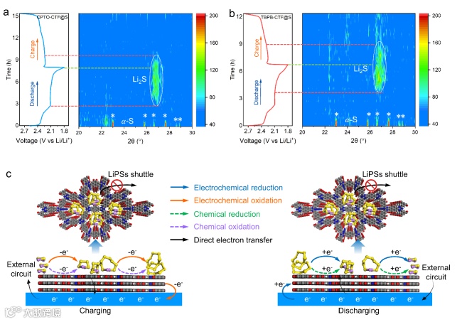 图 4. 锂硫电池的原位XRD测试结果:(a) 采用 CPTO-CTF@S 作为正极的电池;(b) 采用 TBPB-CTF@S 作为正极的电池;(c) CPTO-CTF 作为双功能催化剂在充放电过程中激活 S/Li2S的作用示意图。