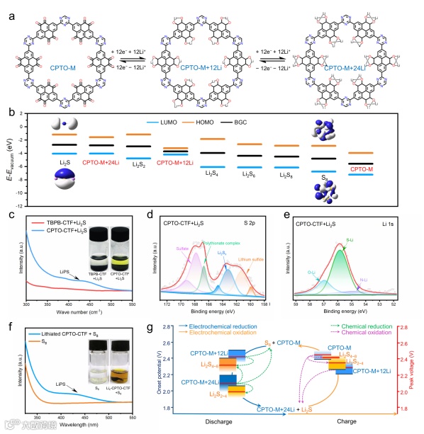 图2. (a) CPTO-M 在 1.7–2.8 V 电压窗口内的锂化反应路径示意图;(b) 硫物种的电子能带;(c) CPTO-CTF+Li2S和 TBPB-CTF+Li2S反应结果;(d) CPTO-CTF+Li2S氧化产物的 S 2p 光电子能谱;(e) CPTO-CTF+Li2S氧化产物的 Li 1s 光电子能谱;(f) 锂化 CPTO-CTF+S8 反应实验;(g) CPTO-CTF 作为双功能催化剂激活 S/Li2S反应路径的示意图。
