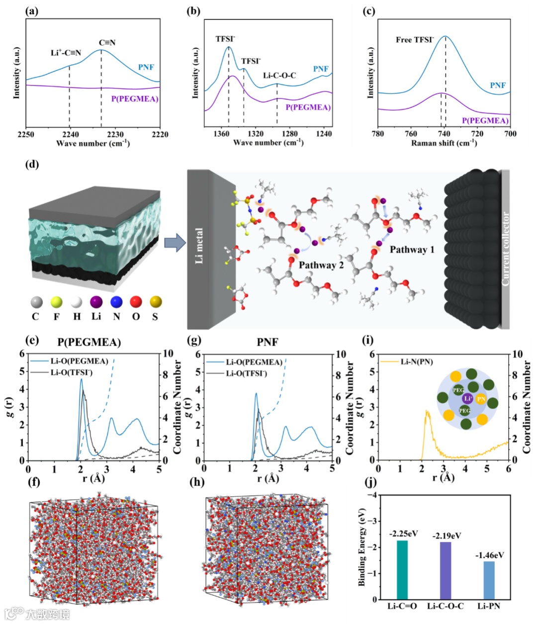 图2. (a) 2220-2250 cm-1 及 (b) 1230-1380 cm-1 范围内PNF与P(PEGMEA)的FT-IR光谱。(c) PNF与P(PEGMEA)的Raman光谱。(d) PNF电解质中锂离子迁移路径示意图。(e, f) P(PEGMEA) 与 (g, h) PNF的径向分布函数及分子快照图。(i) PNF中PN分子与锂离子的径向分布函数。(j) Li-C=O、Li-C-O-C及Li-PN的结合能。
