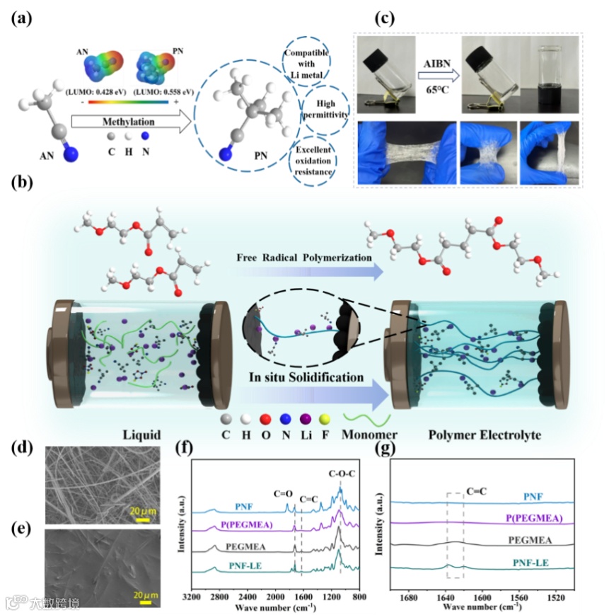 图1. (a) AN甲基化生成PN,以及两种分子的电荷分布等值面图。(b) 聚合物电解质的原位制备示意图。(c) 电解质的宏观光学照片。(d) GFA电解质与(e) PNF电解质的扫描电镜图像。(f) PNF、P(PEGMEA)、PEGMEA及PNF-LE样品的全范围与(g)局部放大傅里叶变换红外光谱。