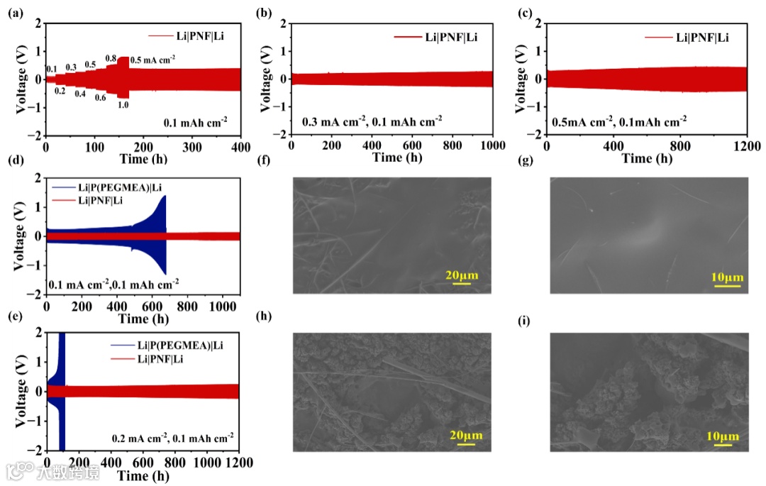 图3. 30℃下Li|Li对称电池在不同电流密度下的恒电流沉积/剥离曲线:(a) 不同电流密度下的曲线;(b) 0.3 mA cm-2 及 (c) 0.5 mA cm-2 电流密度下的长循环曲线;(d) 0.1 mA cm-2 与 (e) 0.2 mA cm-2 电流密度下、固定沉积容量为 0.1 mAh cm-2 的循环曲线。(f, g) Li|PNF|Li 及 (h, i) Li|P(PEGMEA)|Li 对称电池循环后锂金属电极的扫描电镜图像。