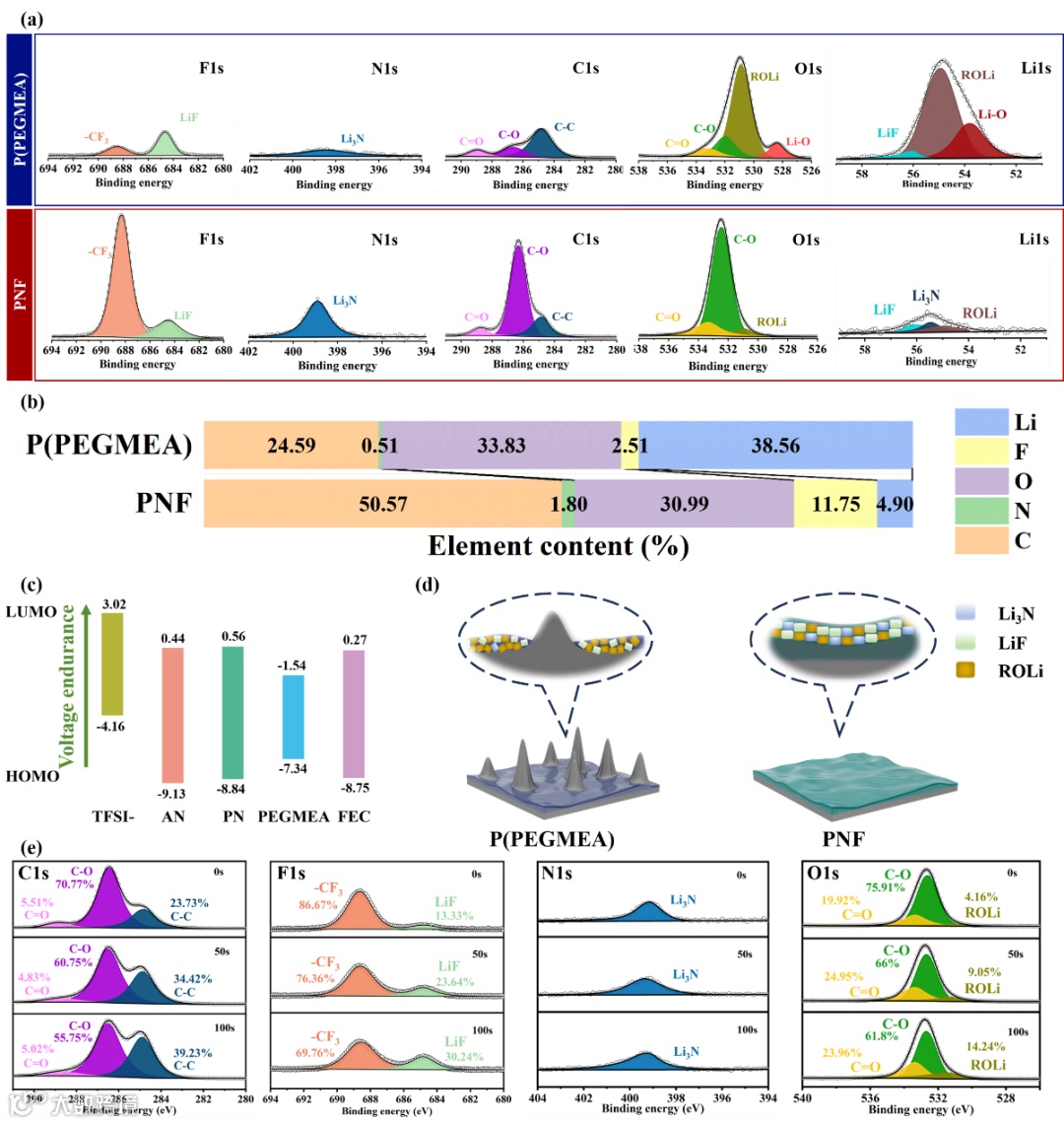 图4. (a) 循环50次后,取自Li|PNF|Li和Li|P(PEGMEA)|Li对称电池的锂电极的XPS谱图。(b) C、N、O、F和Li等各种元素的原子占比。(c) TFSI⁻、AN、PN、PEGMEA和FEC的最高占据分子轨道和最低未占分子轨道能级。(d) 使用PNF和P(PEGMEA)电解质时,锂金属表面SEI层的示意图。(e) 循环后的Li|PNF|Li电池中锂电极的深度剖析XPS谱图。