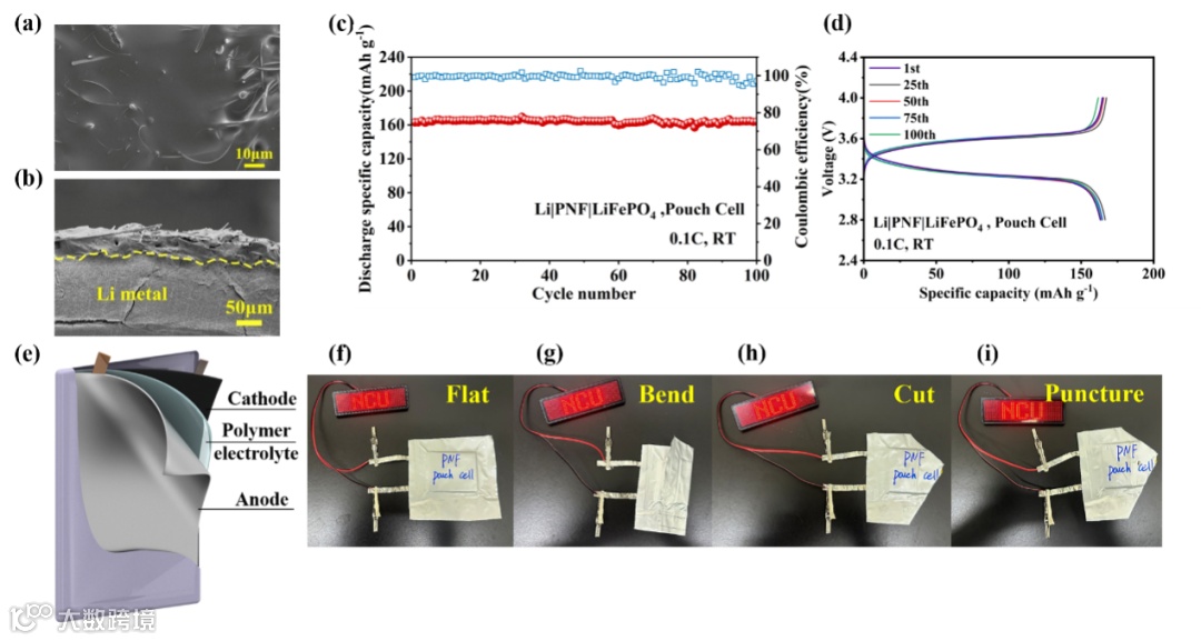 图6. (a) Li|PNF|LiFePO4电池循环1000次后锂金属负极的表面及 (b) 截面扫描电镜图像。(c) Li|PNF|LiFePO4软包电池在0.1C倍率下的循环性能及 (d) 选定的充放电曲线。(e) 采用PNF电解质的软包电池示意图。(f-i) 安全测试:对电池依次进行弯曲、剪切和穿刺操作。