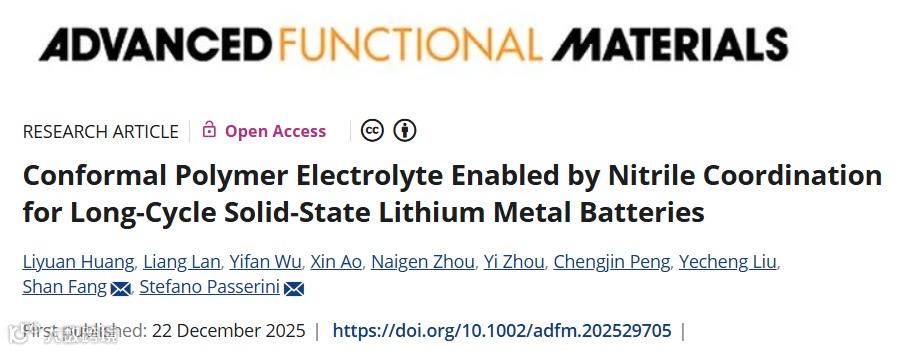 近日,来自南昌大学的方姗、周耐根教授与德国卡尔斯鲁厄理工学院、亥姆霍兹乌尔姆研究所的Stefano Passerini教授合作,在国际知名期刊Advanced Functional Materials上发表题为“Conformal Polymer Electrolyte Enabled by Nitrile Coordination for Long-Cycle Solid-State Lithium Metal Batteries”的文章。该文章提出了一种全新的氰基增塑剂——甲基化乙腈(PN),PN作为乙腈(AN)的甲基化产物,PN有效避免了因活性α-H与锂金属反应引发的副反应问题,显著增强了电极与电解质之间的界面相容性。同时,该电解质在循环过程中于锂金属表面构建了一层兼具刚性结构与柔性特征的有机‑无机复合SEI层,从而为实现长循环固态锂金属电池提供了关键支撑。
