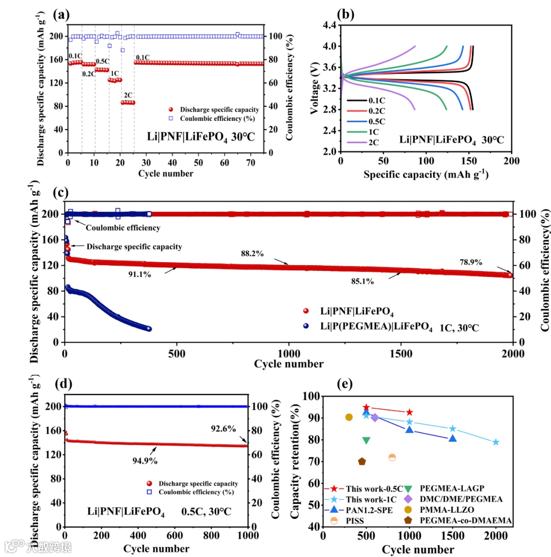 图5. (a) Li|PNF|LiFePO4电池的倍率性能及(b)不同倍率下的对应充放电曲线。Li|PNF|LiFePO4与Li|P(PEGMEA)|LiFePO4电池的长期循环性能:(c) 在1C倍率下及(d) 在0.5C倍率下。(e) 与其它基于PEGMEA的电解质循环性能对比。