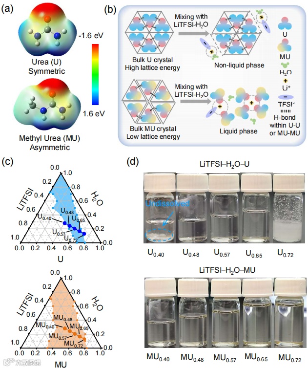 非对称分子构型的甲基脲(MU)相比对称尿素(U)具有更松散的晶体排列与较低的晶格能,能显著拓宽盐-水-有机分子三元体系的液相范围,尤其是低盐浓度区域,为开发低浓度、高性能的水系电解液打开了新空间 -