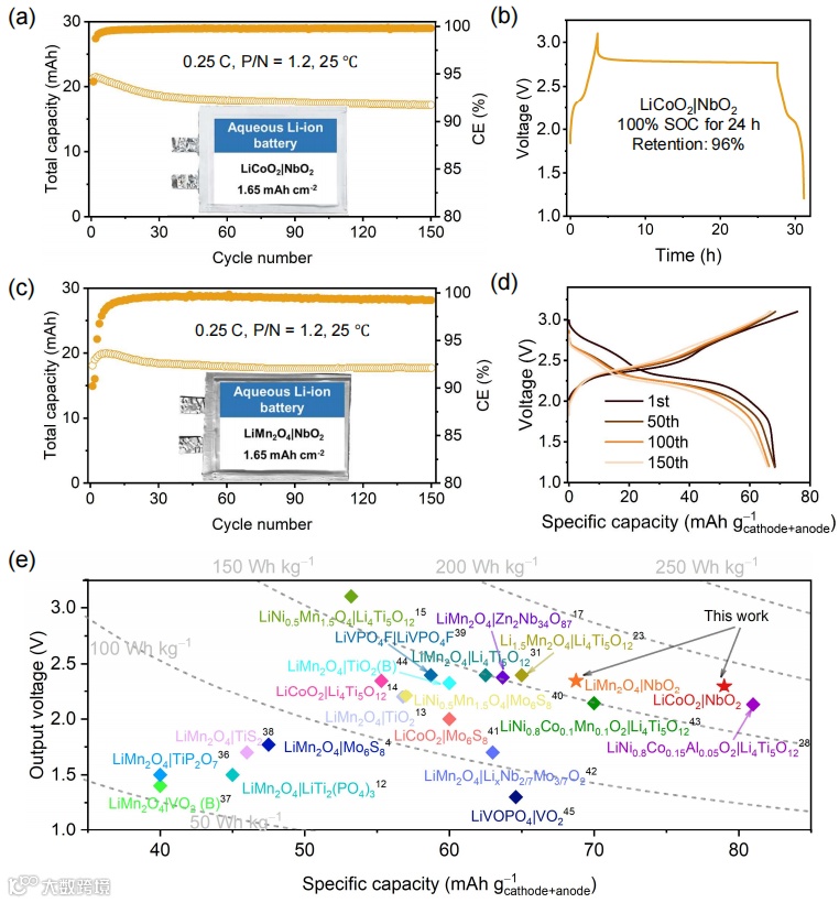 NbO2|LiCoO2和NbO₂|LiMn2O4软包电池分别实现184 Wh kg−1和161 Wh kg−1的高能量密度(基于正负极活性物质计算),优于文献报道的水系锂离子电池 -