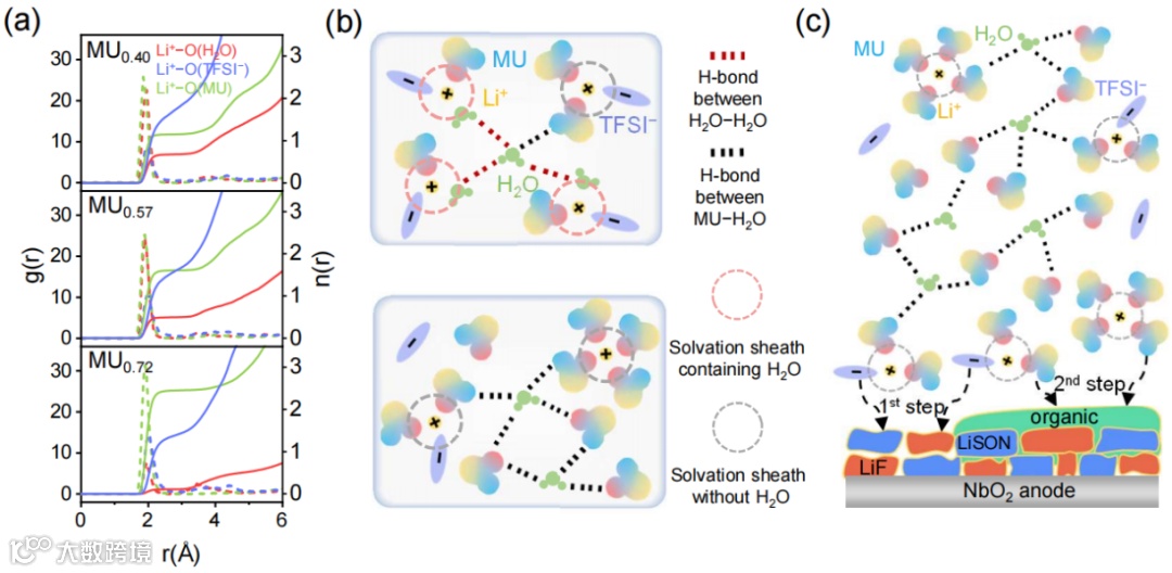 独特溶剂化结构使TFSI⁻和MU的LUMO能级低于水,优先还原分解,形成外有机-内无机双层SEI,有利于抑制低电位的析氢副反应