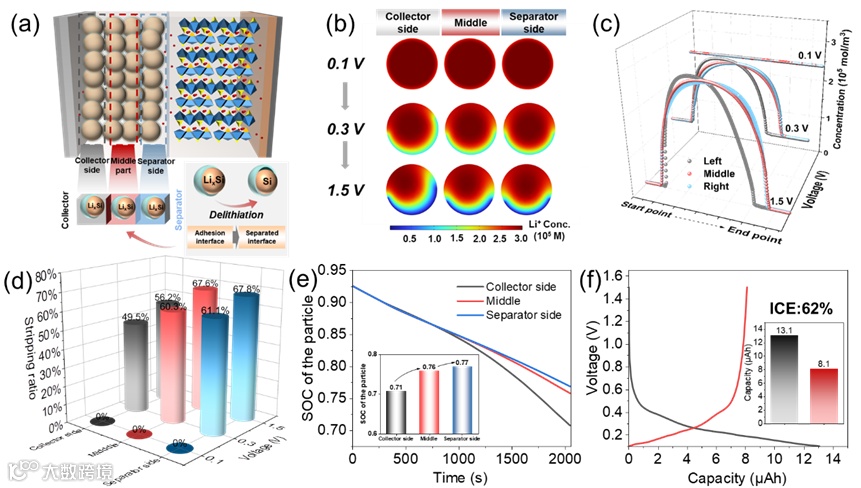 为了从本质上理解SEI内部孔洞这一结构力学行为,构建了一个力-电耦合球型颗粒模型,并引入了内聚力模型(CZM)来描述SEI/硅的界面可剥离性。在考虑界面剥离情况下计算的ICE为62%,与实验结果高度吻合,支持了界面剥离是低ICE的内在诱因这一机制。模型还发现电极内部空间位置差异会造成剥离特性的差异,靠近集流体侧颗粒受到集流体牵引作用,剥离程度低,表现出更高的容量利用率。