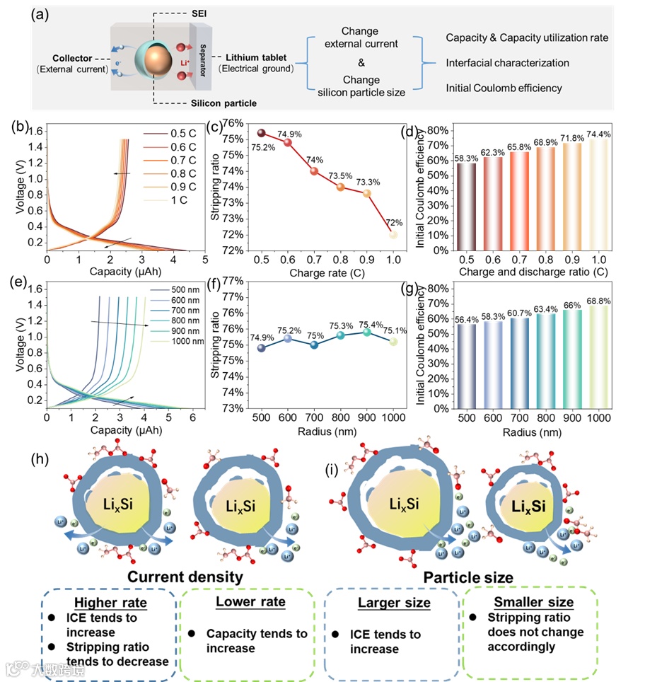 图3.硅颗粒粒径和电流密度变化对界面特性和电池性能的影响。