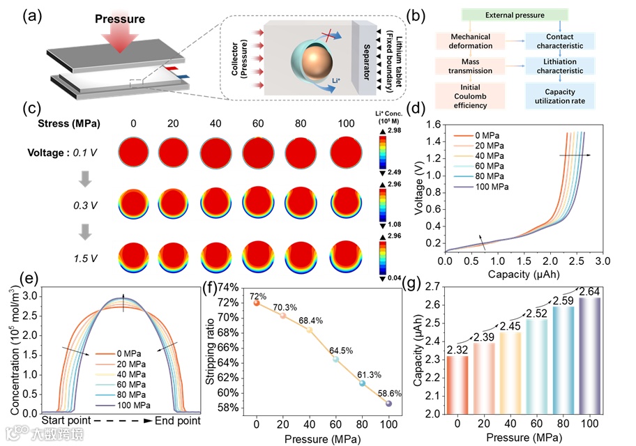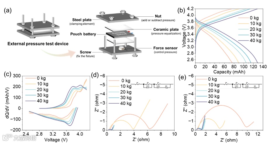 为验证这一机制设计了一个电池压力测试系统,由一个加压夹具组成,配有两块钢制压缩板、用于压力分布和防止短路的陶瓷板、用于压力控制的力传感器,以及用于压力调节的螺母组件。对软包电池的循环充放电测试显示,随着外部压力的升高,容量逐渐增强。详细的dQ/dV分析显示,放电峰间水平间距减少与极化减弱相关,表明SEI附着力提升降低了界面阻抗。低压下较宽的峰值确认了由于界面接触不良导致离子电子传递迟缓。放电截止时的电荷转移阻抗始终低于无压力条件下的电荷转移阻抗,证实硅颗粒界面剥离现象导致的完全去合金化时阻抗升高。
