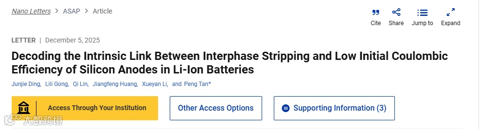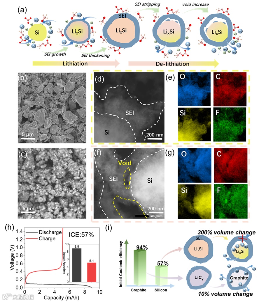 随着能源的市场需求增大,提高能量密度势在必行。硅基锂离子电池凭借高能量密度受到广泛关注。然而,硅在合金化/去合金化过程中伴随着高达300%的体积变化,带来了电极结构塌陷,活性颗粒粉化等问题。尽管纳米化结构设计有效的减轻了电极损伤问题,但低首次库伦效率(ICE)和低容量利用率问题仍缺乏合理解释。近期有部分研究将核心因素瞄向SEI,但其动态作用机理仍令人费解。