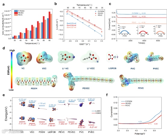 在 25°C下,P-PDEM、PEVC 和 PEVEC 电解质的离子电导率分别为2.39×10−5S cm−1、3.7×10−5S cm−1和3.87×10−5S cm−1(图2a)。环状碳酸酯侧链具有高度极性的羰基,可通过强离子-偶极相互作用有效屏蔽锂盐的静电作用,促进短程离子迁移。值得注意的是,PEVEC的离子电导率略高于PEVC,这归因于空间位阻。对应的阿伦尼乌斯图显示,随着VEC侧链的引入,锂离子扩散的活化能(Ea)从0.375 eV降至0.325 eV(图2b),表明锂离子迁移能力增强。PEVEC较低的能量势垒意味着锂离子与醚氧基团间的结合力减弱,使其能在非晶区更快转移,更利于锂离子传输。计算表明,PEVEC与PEVC的Li+迁移数分别为0.33和0.3,远高于P-PDEM(0.25)及纯PEO电解质(约0.2)²¹(图2c)。