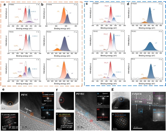 图5 (a–d)循环锂金属负极与LCO正极的C 1s和F 1s XPS光谱。来自含(e) PEVC、(f) PEVEC和(g) P-PDEM电解质的Li/LCO电池中循环LCO正极的透射电子显微镜图像,附对应FFT(插图)及SAED衍射图案。