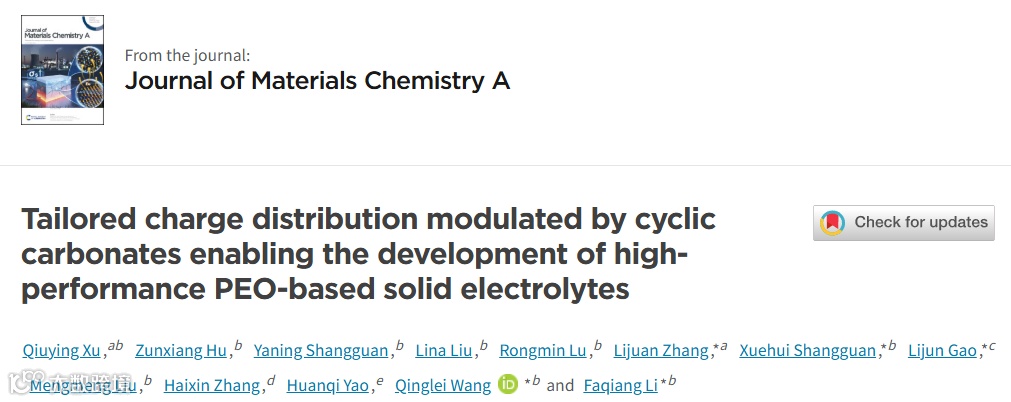 近日,来自临沂大学的李法强教授、王青磊副教授与青海民族大学的张丽娟教授合作,在国际知名期刊Journal of Materials Chemistry A上发表题为“Tailored charge distribution modulated by cyclic carbonates enabling the development of high-performance PEO-based solid electrolytes”的实验文章。该文章通过环状碳酸酯策略实现电荷的定向分布,实现了高性能PEO基固态电解质的开发。该文章探究了不同空间位阻的环状碳酸酯侧链对电化学性能的影响,为实现高性能锂金属电池开辟了新的途径。