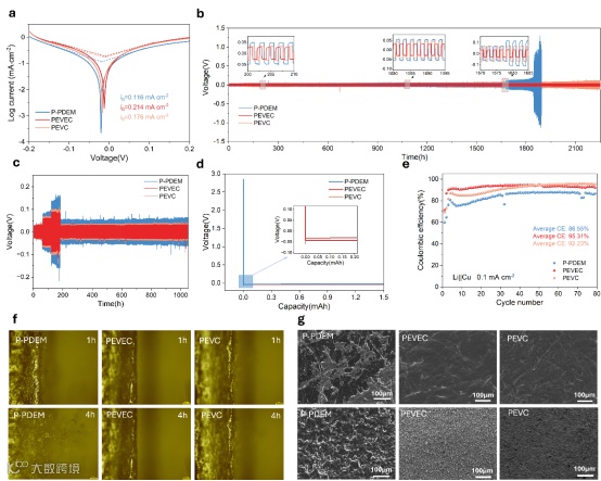 为评估固态聚合物电解质(SPEs)与LMA的界面稳定性与相容性,组装了Li/Li对称电池进行塔菲尔曲线测试(图3a)。交换电流密度(i0)决定着质量传递速率。PEVEC展现出高交换电流密度(0.214 mA cm-2),表明含VEC侧链功能化的电解质在沉积过程中促进了更快的Li+传输和电荷转移动力学。在0.1 mA cm-2条件下,基于P-PDEM的电池经1680小时测试后出现严重电压极化和波动,归因于持续分解和失控的树枝状晶体生长(图3b)。相比之下,PEVEC SPE在2500小时以上保持稳定的沉积/剥离性能,且极化电压较低,证明VEC侧链可增强机械强度并有效抑制树枝状晶体生长。