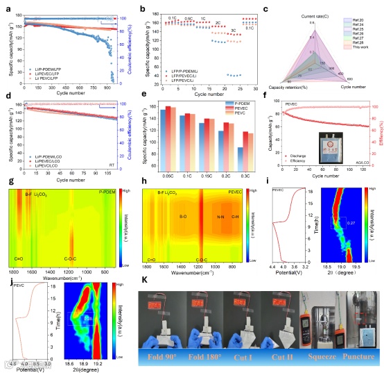 图4 电池的电化学性能。Li/LFP电池的(a)循环性能与(b)倍率性能。(c)近期报道研究与本工作之间的电池性能对比。(d)采用三种电解质的Li/LCO电池的循环性能与(e)倍率性能。(f)采用PEVEC固态电解质的GR/LCO软包电池循环性能。插图:软包电池光学图像。电解质原位红外光谱:(g) P-PDEM与(h) PEVEC。电解的原位XRD衍射图谱:(i) PEVEC与(j) PEVC。(k)折叠、切割、穿刺及挤压后点亮LED灯的Li/PEVEC/LCO软包电池数码照片。