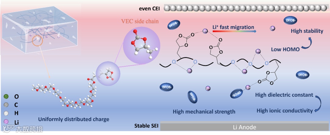 通过环状碳酸酯调控策略构建高效的 SEI/CEI 层,VEC 侧链的空间位阻效应控制了电荷的均匀分布,从而实现了高性能PEO基固态锂金属电池。