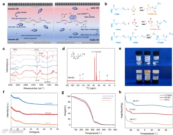 图1 (a) PEVC/PEVEC聚合物电解质的设计概念。(b)电解质的合成路线。(c) VC、VEC、PDEM、P-PDEM、PEVEC和PEVC的FT-IR光谱。(d) PEVEC的¹³C NMR谱图。(e)电解质聚合前后光学图像。P-PDEM、PEVEC和PEVC电解质的(f)XRD图谱和 (g) TG曲线以及 (h) DSC曲线。