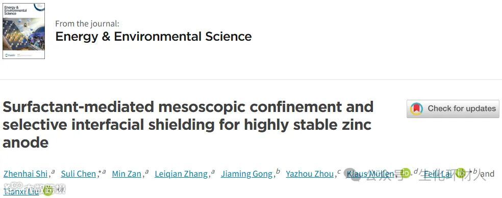 近日,江南大学刘天西/陈苏莉团队联合上海交通大学赖飞立在能源材料领域顶级期刊 Energy Environ. Sci.上发表了题为“Surfactant-mediated mesoscopic confinement and selective interfacial shielding for highly stable zinc anode”的观点文章。该工作提出一种基于两亲性表面活性剂的介观相电解质构筑策略,通过引入生物源表面活性剂槐糖脂(SL),实现了对电解液体相微环境与电极/电解质界面的协同调控。槐糖脂在电解液中可自发组装形成纳米胶束结构,该介观限域环境通过多价偶极‑离子相互作用有效重构Zn2+的溶剂化结构,从而显著提升Zn2+的迁移数与传输动力学。与此同时,未参与胶束形成的游离槐糖脂分子在锌负极表面发生选择性吸附,形成致密的界面保护层。该层不仅通过静电屏蔽效应抑制锌枝晶的随机生长,更借助空间约束作用诱导锌沿(101)晶面进行定向沉积,同时有效阻隔水分子与电极的直接接触,显著抑制析氢与腐蚀等副反应。