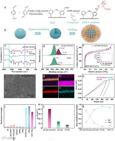 图2. xPCMS-PEGMA保护层的物理化学性质表征。(a) 简明合成过程;(b) 合成示意图;(c) FTIR光谱;(d) xPCMS和xPCMS-PEGMA的XPS;(e) xPCMS-PEGMA的N2吸附等温线及相应孔径分布曲线(插图);(f) 和 (g) xPCMS-PEGMA层的SEM图像及EDS;(h) 负载-压痕深度曲线;(i) 与近期文献报道的力学性能比较;(j) 离子导电性;(k) 离子迁移数(tZn2+ 和 tSO42-)。