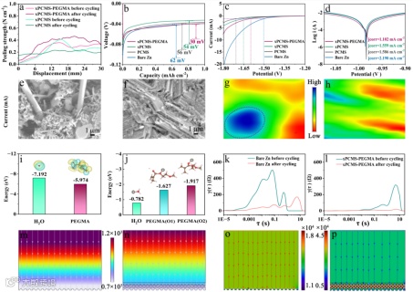 图3. Zn 沉积行为。(a)剥离强度;(b)在 Cu 上以 2 mA cm−2沉积 Zn²⁺ 的电压曲线;(c)LSV和(d)Tafel 曲线,扫描速率为 1 mV s⁻1;(e)无修饰Zn 和(f)xPCMS-PEGMA@Zn 阳极在 100 次循环后的沉积侧SEM 图像;(g, h)无修饰Zn 和 xPCMS-PEGMA@Zn 阳极在 100 次循环并剥离保护层后(1 mA cm−2,0.5 mAh cm−2)的微区 FTIR 映射;(i)HOMO 能级和(j)无修饰Zn 与 xPCMS-PEGMA@Zn 阳极的结合能;(k)无修饰 Zn 和(l)xPCMS-PEGMA@Zn 阳极在 100 个循环后(1 mA cm−2,0.5 mAh cm−2)的DRT分析;(m)无修饰Zn 和(n)xPCMS-PEGMA@Zn 的离子浓度场模拟。(o)无修饰 Zn 和(p)xPCMS-PEGMA@Zn 的电场模拟。