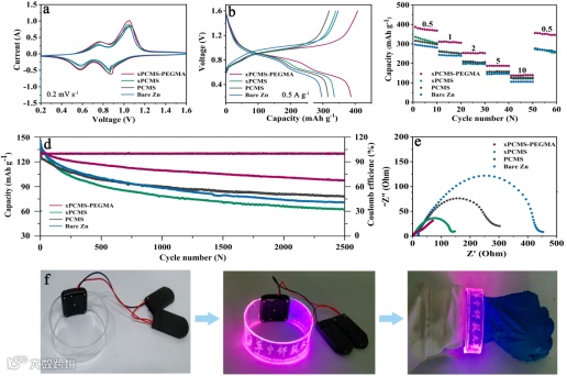 图5. 全电池电化学性能。(a) CV曲线;(b)和 (c) 0.5 A g⁻¹下的速率性能和恒电流充放电曲线;(d) 循环性能;(e) 老化24小时后的Nyquist图;(f) 由xPCMS-PEGMA Zn//NVO电池供电的发光手环的实物照片。