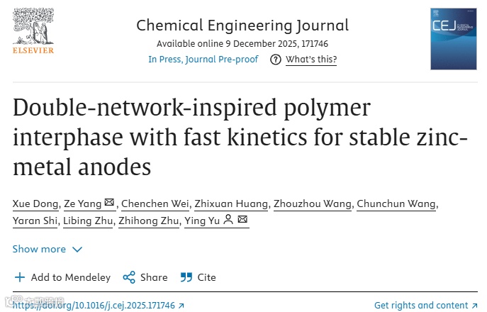 近日,来自华中师范大学的余颖教授和杨泽副教授在国际知名期刊Chemical Engineering Journal上发表题为“Double-network-inspired polymer interphase with fast kinetics for stable zinc-metal anodes”的文章。该文章有效的解决了目前锌负极界面层存在的多个功能间权衡的问题,为稳定锌负极提供了创新策略。