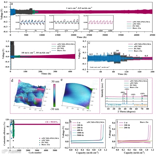 图4. Zn 沉积/剥离的可逆性及其可视化。对称电池在(a) 1 mA cm−2,0.5 mAh cm−2下和(b) 10 mA cm−2,10 mAh cm−2下的循环稳定性;(c) 对称电池倍率性能;(d) 和 (e) 为无修饰Zn 和xPCMS-PEGMA@Zn 剥离涂层后的AFM图像;(f) 循环后的 xPCMS-PEGMA@Zn、xPCMS@Zn 和 PCMS@Zn 剥离涂层后以及无修饰 Zn的 XRD 图谱;(g) Zn//Cu 非对称电池的库伦效率;(h) xPCMS-PEGMA@Zn 及 (i) bare Zn 的沉积/剥离曲线。