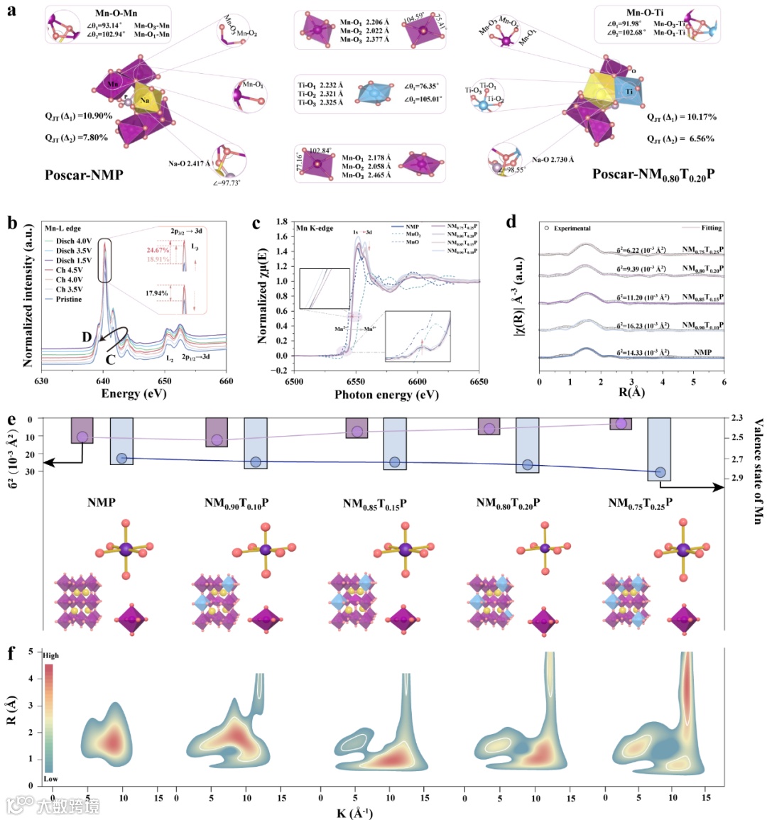 图 2:通过 XANES/EXAFS/轨道杂化对 NaMn₁₋ₓTiₓPO₄ (NM₁₋ₓTₓP) 正极进行的电子结构与键合分析。a) NMP 和 NM₀.₈₀Ti₀.₂₀P 的 DFT 优化晶体结构;(b) NM₀.₈₀Ti₀.₂₀P 在选定电压下充放电过程中的操作 Mn L-edge NEXAFS 谱;(c) NM₀.₈₀Ti₀.₂₀P 的 Mn K-edge XANES 谱;(d) NM₁₋ₓTiₓP 的 Mn K-edge EXAFS 谱的傅里叶变换及拟合曲线;(e) NM₁₋ₓTₓP (x = 0, 0.10, 0.15, 0.20, 0.25) 中 Mn–O 键长无序度 (σ²) 与平均 Mn 氧化态之间的相关性;(f) NM₁₋ₓTₓP 的 Mn K-edge EXAFS 谱的小波变换图。