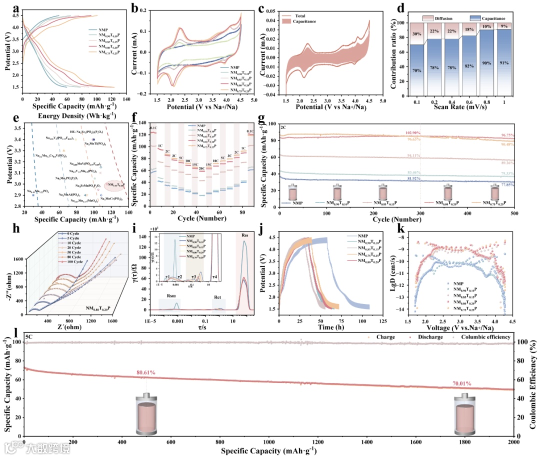 图 4:Ti 改性 NM₁₋ₓTₓP 正极的电化学性能与 Na⁺ 扩散动力学。(a) 0.1 C 倍率下的恒电流充放电曲线;(b) 扫描速率为 1.0 mV·s⁻¹ 的循环伏安曲线;(c) NM₀.₈₀T₀.₂₀P 的赝电容贡献分析;(d) 电容性与扩散控制贡献比率;(e) 0.1 C 倍率下的对比放电容量与能量密度;(f) 从 0.1 C 到 20 C 的倍率性能;(g) 2 C 倍率下循环 500 次的循环稳定性;(h) 循环后电化学阻抗谱的演变;(i) 交流阻抗的弛豫时间分布;(j) 钠化与脱钠过程中的恒电流间歇滴定技术 (GITT) 曲线;(k) 基于 GITT 计算的 Na⁺ 化学扩散系数;(l) 5 C 倍率下的长循环性能(2000 次循环)。